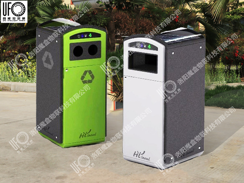 垃圾箱通過不同投放口進行垃圾分類引導(dǎo),內(nèi)部設(shè)有壓縮系統(tǒng),用箱頂?shù)奶柲茈姵匕骞╇?可自動對投入的垃圾進行壓縮。