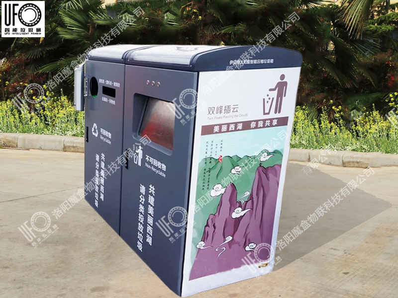 垃圾箱通過不同投放口進行垃圾分類引導,內(nèi)部設(shè)有壓縮系統(tǒng),用箱頂?shù)奶柲茈姵匕骞╇?可自動對投入的垃圾進行壓縮。